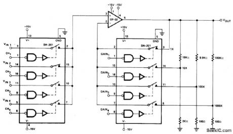 The circuit in the figure shows how an analog, digitally programmable filter can be built using a UAF42. This monolithic, state-variable active filter chip provides a two-pole filter building block with low sensitivity to extemal component variations. It eliminates aliasing errors and clock feed though noise common to switched-capacitor filters. Low-pass, high-pass, bandpass, and notch (band-reject) outputs are available. (View)