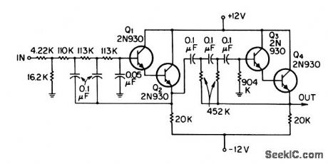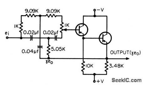 Potentiometer adjusts amount of rejection to compensate for tolerances of components. Second emitter-follower provides lower output impedance so feedback to network is more effective in sharpening notch of filter characteristic and in decreasing phase shift around null frequency. Used in servo sys terns.-T. Mollinga, Actiye Parallel-T Net.works, EEE, 14:4, p 93-98, (View)