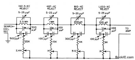 Will trap out 10-Mc noise while passing 10.Mc signal in heterodyne frequency convertor used to extend measurement range of 10-Mc counter. Operation is based on difference in level of noise and desired signal. Dynamic action of filter nulls out low-level noise, but filter disappears in presence of desired high-level signal. -H. T. McAleer, Dynamic Notch Filter, FEE, 10:9, p 90-91. (View)