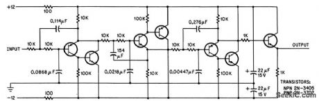 Slope can be any desired multiple of 12 db per octave, with insertion loss less than 2 db.Corner frequencies are 200 radians per sec (32 cps) and 40,000 radians per sec (6,370 cps).-W. D. Fryer, How to Design Low Cost Audio Fillers, Electronics, 32:15, p 68-70. (View)