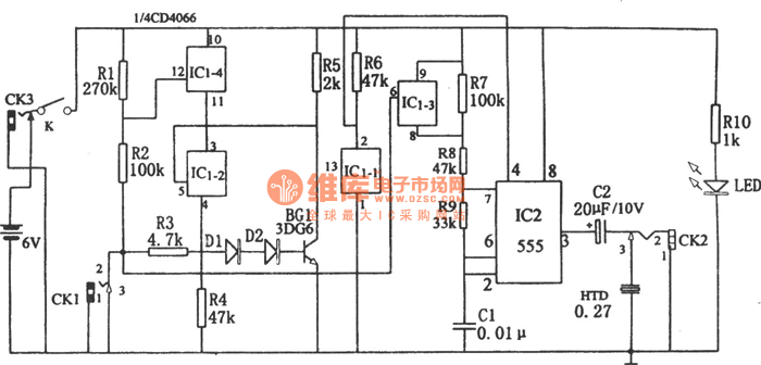 The circuit is mainly composed of multivibrator, four bidirectional switch CD4066 (IC1) and gate circuit with some resistive and capacitive components. The multivibrator 555 (IC2) consists of R7 , R8 , R9 and C1, and its oscillation frequency is affected by the off state of IC1-3.