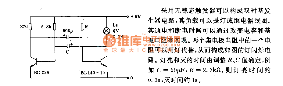 Double time base generator circuit can be composed of astable trigger, the load can be light or relay coil. The on/off time depend on the capacitance and base resistance. One of two collector resistances can be replaced by light, then to form the light flashing circuit. The time of light on/ off is decided by R, C, such as C=50μF, R=2.7KΩ, then the light time is about 0.3s, the off time is about 1s.