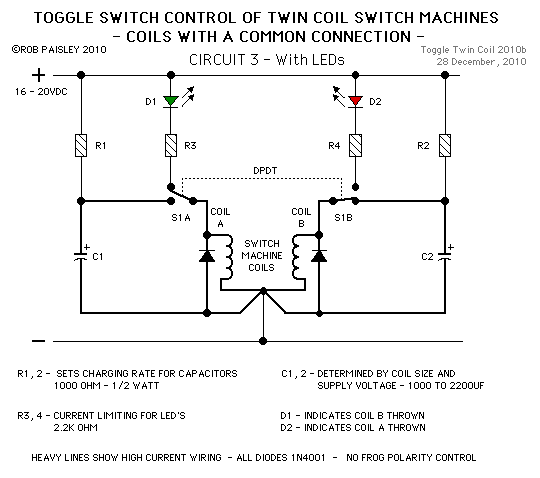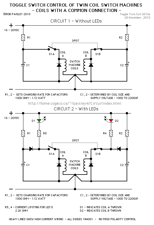 The first three circuits are for use with switch machines that have an unbreakable connection between the two coils such as those made by Atlas®. These circuits can also be used with twin coil switch machines that have separate coils.
