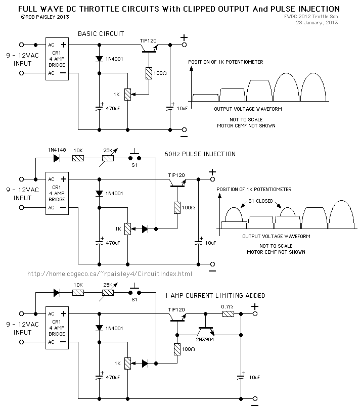 The following circuits are variations of a full wave DC throttles. The output voltage is clipped at a voltage level determined the 1K potentiometer so that the waveform is flat for most of the cycle. These throttles have good slow speed operation for typical DC motors.