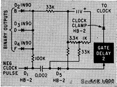Negative output dock pulses of 256-pctmmeter microwave system checker are applied to gaing diode D1, which ordinarily blocks signal to delay mvbr. During eighth pulse of code train, diodes D2-D3-D4 receive negative voltage from their binary outputs and make D1 trigger mvbr through D5. At end of mvbr delay, damp is removed until eight more pulses arrive.-J. B. Bullock, Pulse-Coded Fault Alarm in Microwave Systems, Electronics, 33:1, p 82-84.