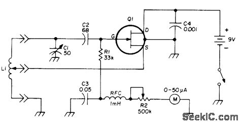 Solid.state-version of vacuumtube grid-dip meter gives dip from 50 to about 20 pA on most bands in range of 1.8 to 150 MHz when dipper is held 1 inch away from resonant circuit under test. Uses Siliconix 2N5398 UHF JFET, but MPFl07 (2N5486) can also be used.Coil tap position is more critical at higher frequencies; adjust tap for most pronounced dip.Article gives coil data for five frequency ranges.-C. G. Miller, Gate-Dip Meter, Ham Radio, June 1977, p 42-43.