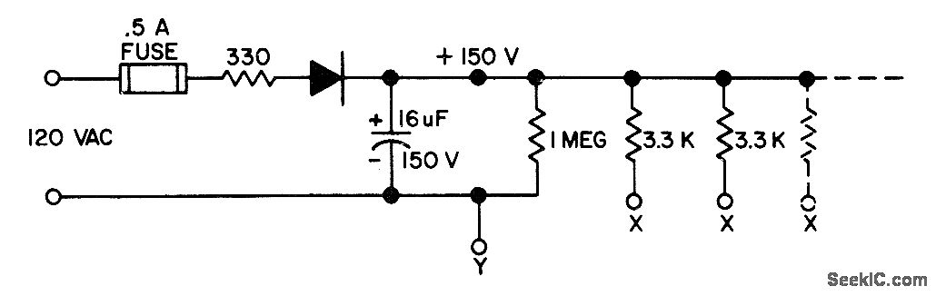 Simple power supply drives any desired number of alphameric Nixie characters each 21/2inches high to form illuminated house numbers, ON THE AIR sign for amateur station, or BAR IS CLOSED sign for party room. Connect 3.3K resistorfrom +150 V to pin 13 of each Nixie, and connect to point Y (-150 V) each segment to be lighted. Sign can be changed at any time by resoldering connections to segments.Diode must handle AC line voltage.-J.Grimes,Display Yourself in a Big Way,73 Magazine, Nov./Dec,1975,p 186-188.