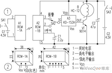 The circuit is showed as the picture and the transmitter is composed of wireless remote control launch module,A1 and battery G1 and the power switch SA1. Receiving alarm consists of wirless remote control receiving module,A2 andsimulated sound integrated circuit A3 etc.