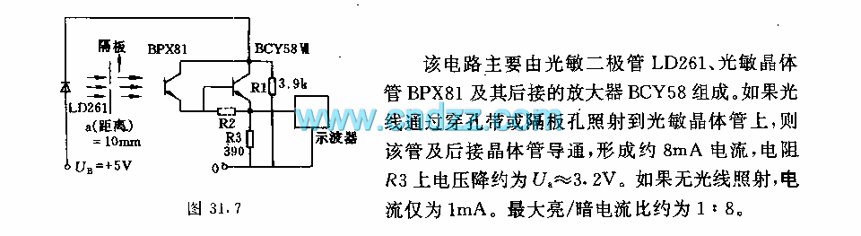 The circuit is mainly composed of the LD261 photodiode, phototransistor BPX81 and following connected amplifier BCY58. If the light is reflected to the phototransistor through the punched tape or bulkhead hole, the pipe and following connected transistor is conduction to form a current which is about 8mA, and voltage Ua on resistor R3 is about 3.2V. If there is no light irradiation, the current is only 1mA. The maximum bright, dark current ratio is about 1:8.