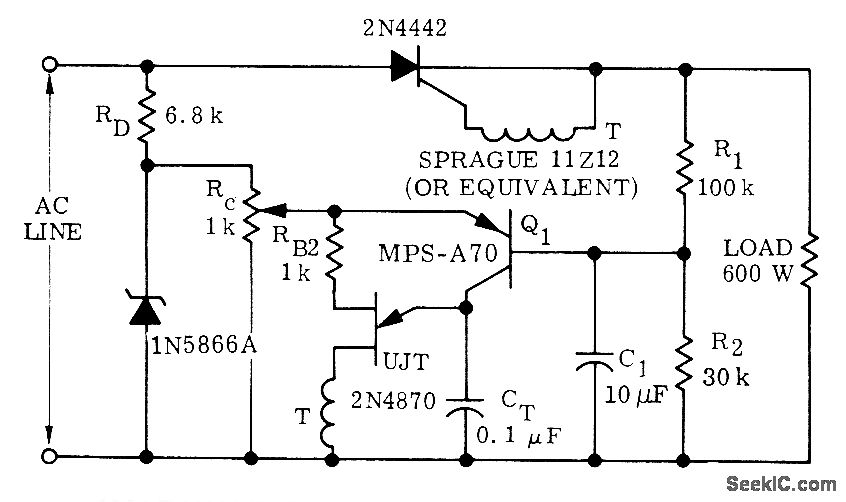Provides phase control of power to resistive load in applications where average load voltage is desired feedback variable. RC network R1-R2-C1 averages load voltage so it can be compared with set point on Rc by Q1.-D. A. Zinder, Unijunction Trigger Circuits for Gated Thyristors, Motorola, Phoenix, AZ, 1974, AN-413,p 4.