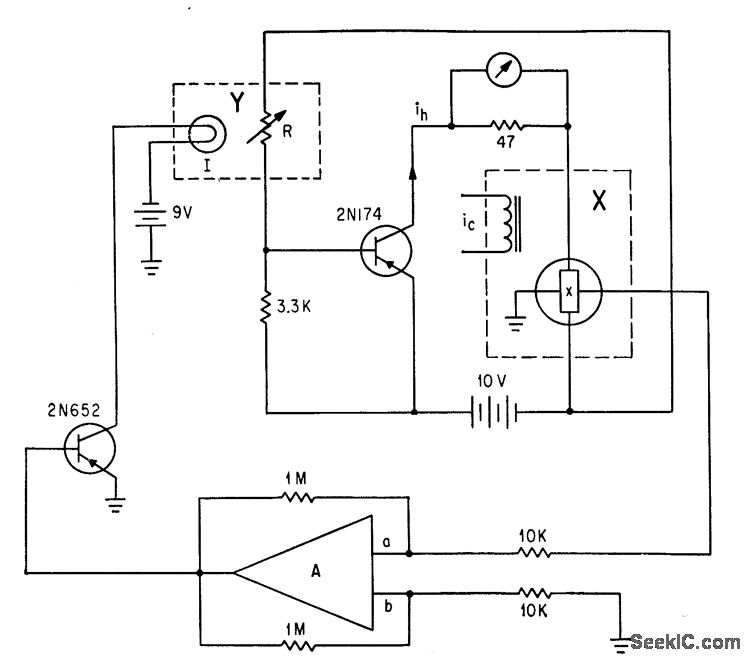 Indium arsenide Hall plate serves as analog multiplier in circuit with photoresistor R and 2N174 grounded-emitter power amplifier that controls drive current of Hall generator. Differential amplifier A in feedback loop including lamp I controls Hall current. -H. H. Wieder, Analog Ratio Computer Uses Hall Multiplier, Electronics, 36:45, p 46-47.