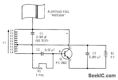 Single-transistor RF oscillator is tuned to generate frequency about 455 kHz above oscillator frequency of transistor radio. With aluminum-foil antenna away from nearby objects and radio tuned be-tween stations, R1 is adjusted until highpitched tone is heard from radio. Now, as hand is brought toward and away from foil antenna, wailing sounds are produced. With practice, musician can produce recognizable melodies by vibrating hand. Primary controls of frequency are C1 (10-365 pF broadcast radio tuning capacitor) and adjustable antenna coil L1 (Radio Shack 270-1430). Radio can be up to 15 feet away from theremin. Rotate radio for maximum pickup from L1-F. M. Mims, Electronic Music Projects, Vol. 1, Radio Shack, Fort Worth, TX, 1977, 2nd Ed. p 81-89.
