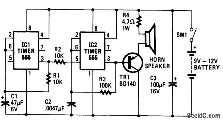 The oscillator based on IC2 is responsible for producing the sound. Its output is connected to the base of TR1, which amplifies it to drive the speaker. Resistor R4 is included in the circuit to limit the current through TR1 to a safe and reasonable level. The oscillation frequency of IC2 is partially dependent on the values of R3 and C2. Another factor that governs the frequency of oscillation is the magnitude of voltage fed to pin 5 of IC2. If a voltage of varying magnitude is fed to pin 5, the internal circuitry of the IC is forced to reset at a different rate, which changes the frequency.IC1 is also connected as an oscillator,but it runs much slower than IC2: around 1 Hz. Each time the IC triggers, the voltage at pin 3 goes high. As pin 3 is connected to pin 5 of IC2, this forces IC2 to change its note. That produces the hee-haw sound of the siren.