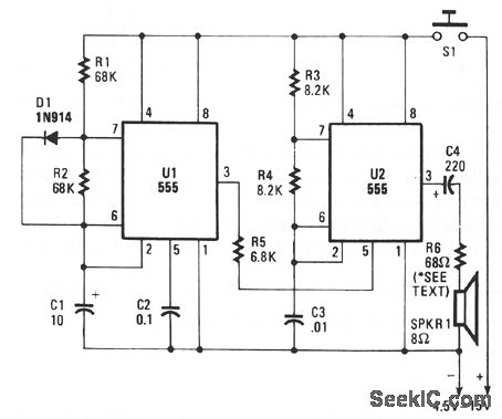 A pair of timer IC's are the heart of a circuit that simulates the warbling hee-haw of a British police siren. One of the 555 timers, U2, is wired as an astable multivibrator operating at about 900 Hz. The other, U1, operates at approximately 1 Hz. Its output at pin 3 is a square wave with a 50% duty cycle-on and off cycles of about 0.5 second each. The output of U1 is applied to pin 5, the control-voltage terminal of U2. The frequency of the 555 timer IC is relatively independent of supply voltage, but can be varied ever a fairly wide range by applying a variable voltage between pin 5 and ground. When U1's output becomes high, U2 operates at about 800 kHz. That switching between two frequencies produces the warbling hee-haw signal.