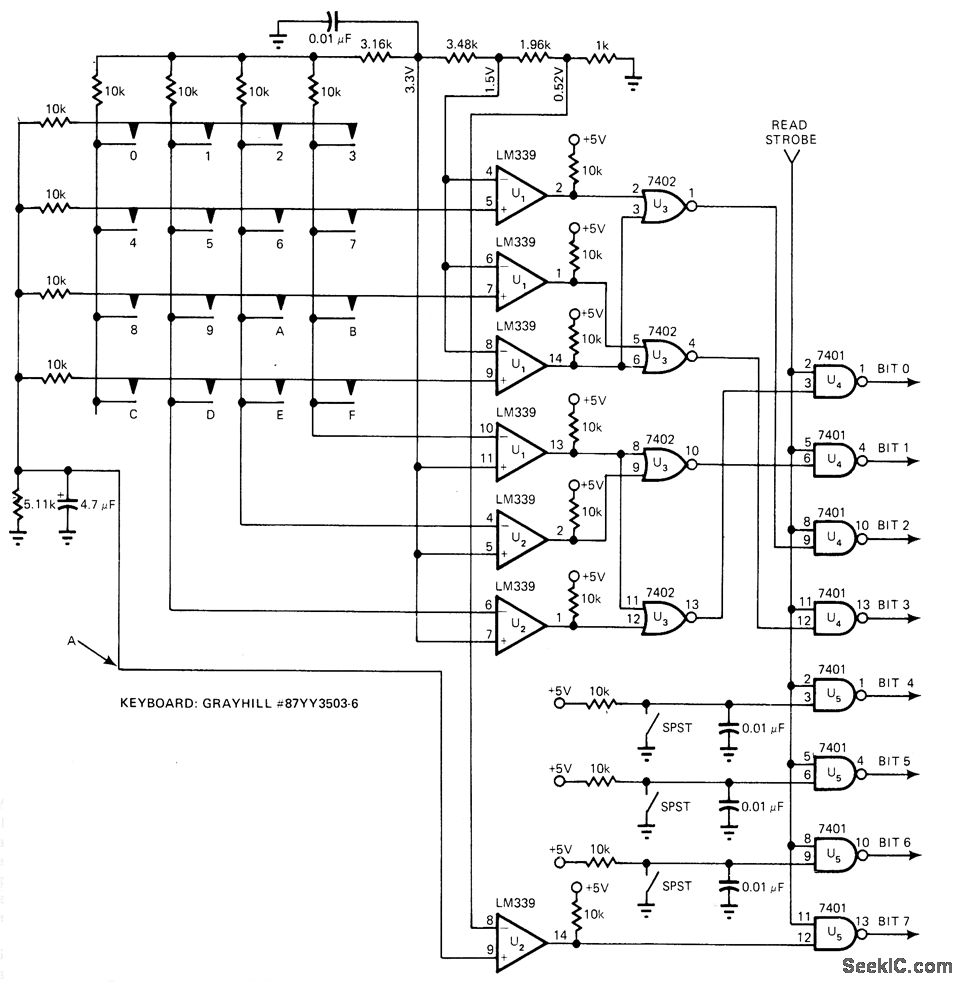 Circuit provides correct hexadecimal output for each key depressed, along with enable level that indicates when key has been pressed, and three switches for providing eight separate codes serving for program control. When no key is pressed, voltage at point A (lower left) and any horizontal keyboard row is 0 V and voltage on any vertical keyboard column is 5 V. When key is pressed, voltage at A becomes 1 V and voltage at selected row and column becomes 3 V. Comparator outputs for U1 and U2 are decoded with N0R gates and strobed onto data lines with open-collector NAND gates.-J. F. Czebiniak, Simple Hex Keyboard Provides Program Control, EDN Magazine, Jan. 5, 1978, p 27-28.