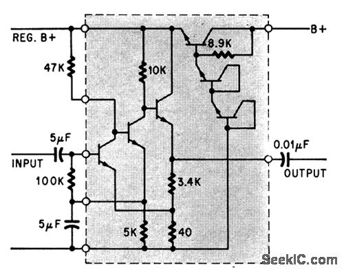 Has strong negative feedback and built-in power supply series regulator.-D. D. Robinson, Linear Microcircuits Scarce? Now You Can Breadboard Your Own, Electronics, 37:27, p 58-64.