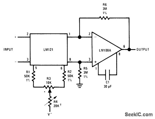 NationaI LM121 differential amplifier is operated openloop as input stage for input signals up to ±10 mV. Input voltage is converted to differential output current for driving opamp acting as current-to-voltage converter with single-ended output. R4 is adjusted to set gain at 1000. Null pot R3 serves for offset adjustment. - Linear Applications, Vol, 2, National Semiconductor, Santa Clara, CA, 1976, AN-79, p 7-8.