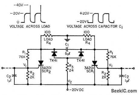 Simple astable circuit design eliminates external trigger, minimizing number of components. Voltage dividers R1 and R2 provide gate voltage for scr's. Both dividers start charging associated capacitors C2 until one scr breaks down, initiating oscillation. Used in converter power supplies.-W. B. McCartney and E. O. Uhrig, Actable High Power Multivibrator, EEE, 10:12, p 30-31.