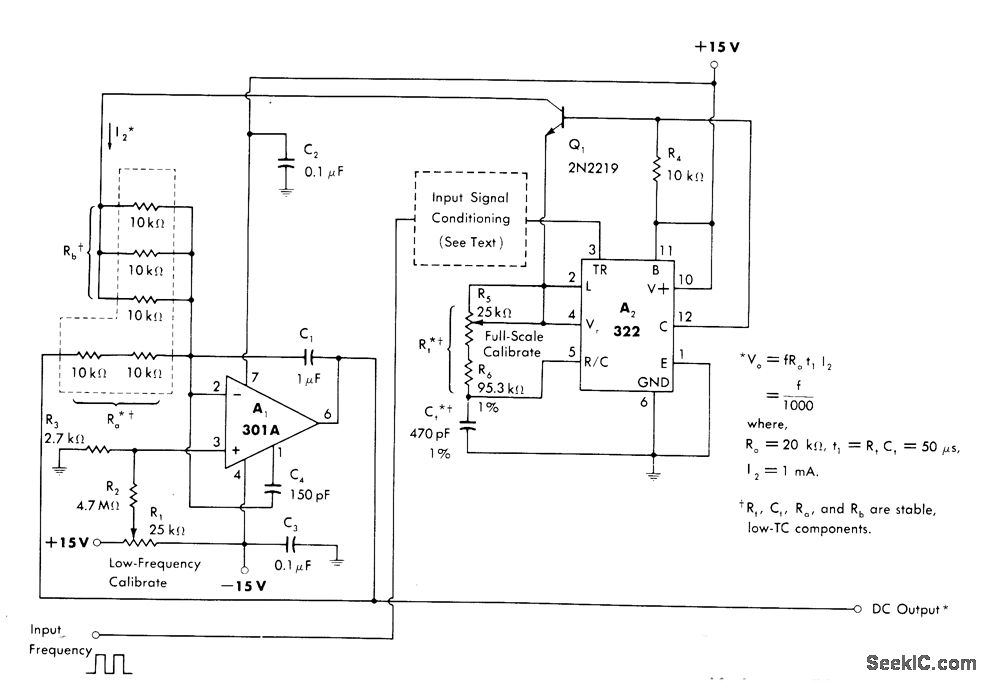 Components of V/F converter are reconnected to provide F/ V function.Inputfrequency up to 10 kHz is fed to 322 mono MVBR A2, either directly if pulsed or indirectly after conditioning. For low-frequency or slowly changing waveforms, zero crossing detector is used forinρut conditioning,A1isconnected asscaling amplifier and filter.-W. G .Jung, ''IC Timer Cookbook,″Howard W .Sams、lndianapoils,IN,1977,ρ 192-196.