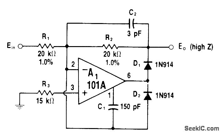 Produces inverted haff-wave replica of input signal with Iow error at frequencies up to 100 kHz. C1 provides feed-forward compensation. For negative-going output. reverse connections to diodes.-W. G. Jung. IC Op-Amp Cookbook. Howard W. Sams. Indianapolis. IN. 1974. p 191-192