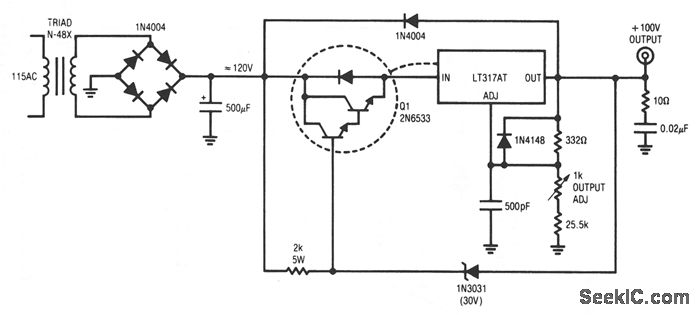 The regulator delivers 100-V at 100 mA and withstands shorts to ground。Even at 100 V output,the LT317A functions in the normal mode,maintainting 1.2 C between its output and adjustment pin.Under these conditions, the 30-V zener is off and Q1 conducts.When an output short occurs, the zener conducts, forcing Q1's base to 30 V. This causes Q1's emitter to clamp 2 VBES below VZ, well VIN-VOUT rating of the regulator.Under these conditions,Q1,a high-voltage device,sustains 90 V- VCE at whatever current the transformer specified saturates at 130 mA,while Q1 safely dissipates 12 W.If Q1 and the LT317A are thermally coupled, the regulator will soon go into thermal shutdown and oscillation will commence,This action will continue, protecting the load and the regulator as long as the output remalns shorted.The 500-pF capacitor and the 10 Ω/0.02 μF damper aid transient response and thediodes provide safe discharge paths for the capacitors.