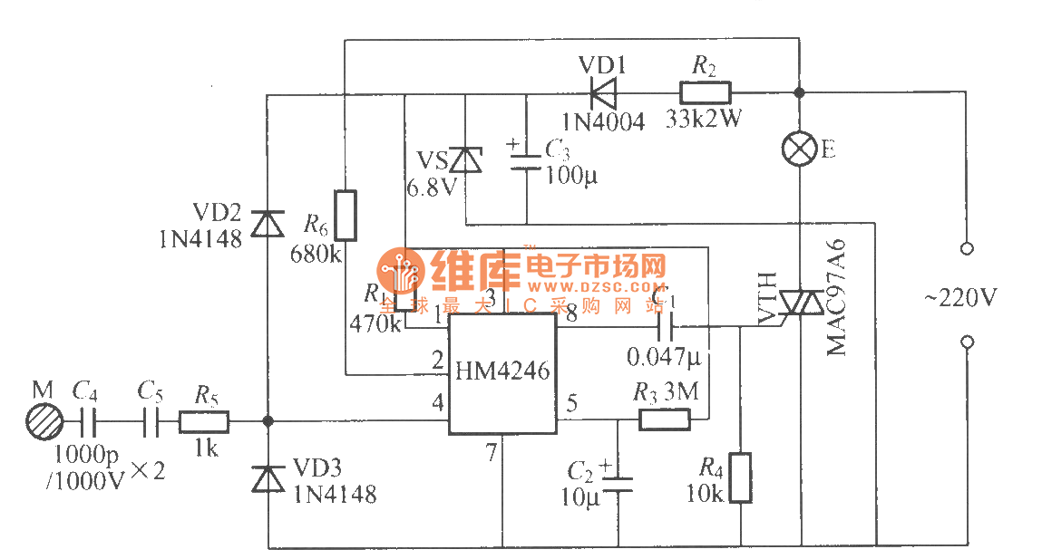 HM4246 is the touching dimmer-specific integrated circuit which is produced by Wuxi Huafang microelectronics Co., Ltd. It has 4 dimming blocks of dark, medium, light, touch to be used as zero trigger, low high-frequency harmonic radiation. It has higher touch sensitivity and stability to adapt to a longer and higher sensor board to connect the load (400pF), which is mainly used for lamps and other lighting dimming, and the circuit is shown as the chart.