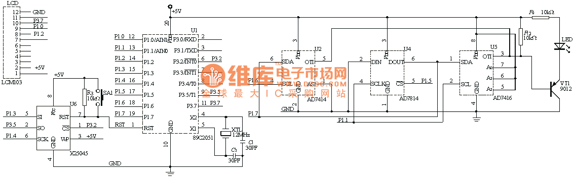 (1) address of each device is different, and SDA, DOUT leads can be connected directly; AD7414, OTI output line (active low), now overrun alarm indication for the AD7416. (2) due to the inertia of the temperature coefficient of the larger, can be a simple and effective method of moving average, median method, low-pass filtering method for software filtering. In practical applications, the side of the sample side, the average of the average value as the temperature samples. Sampling frequency of 8 to 16 times can be. (3) The system uses LCM103 LCD module for temperature display, X25045 for power-on reset and watchdog with.