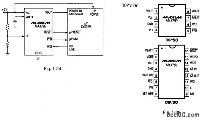 Figures 1-24 and 1-25 show a typical application circuit and pin configurations, respectively, for the MAX790/791. The IC is similar to the MAX690 series (Figs. 1-14 and 1-15), but with several improvements, including 70-μA supply current, 10-ns CE propagation delay, 250-mA output current (VCC mode), and 25-mA output current (VBATT mode). The MAX790 is pin compatible with the MAX690. The reset output is guaranteed to be in the correct state for VCC down to 1 V. MAXIM NEW RELEASES DATA BOOK, 1992, P. 5-53.