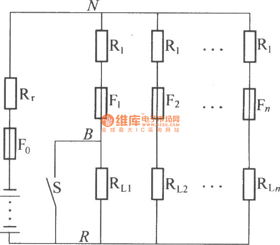 The figure is a circuit diagram of high resistance power distribution. The marked differencebetween it and DZL power distribution is the current limiting resistor R1 which tandem connection specific contact resistance in every shunt load, the general value is 5 times to 10 times of battery internal resistance. If one of the shunts short circuiting, because of the R1 limiting short-circuit current, at the same time the L×di/dt is lesser too. As shown is the voltagechange schematic diagram between N and R. The R1 and Re can make the change of voltagebetween N and R which isallowed in theerror rangeofpower supply system , it makes the loads in the system mutual independence.