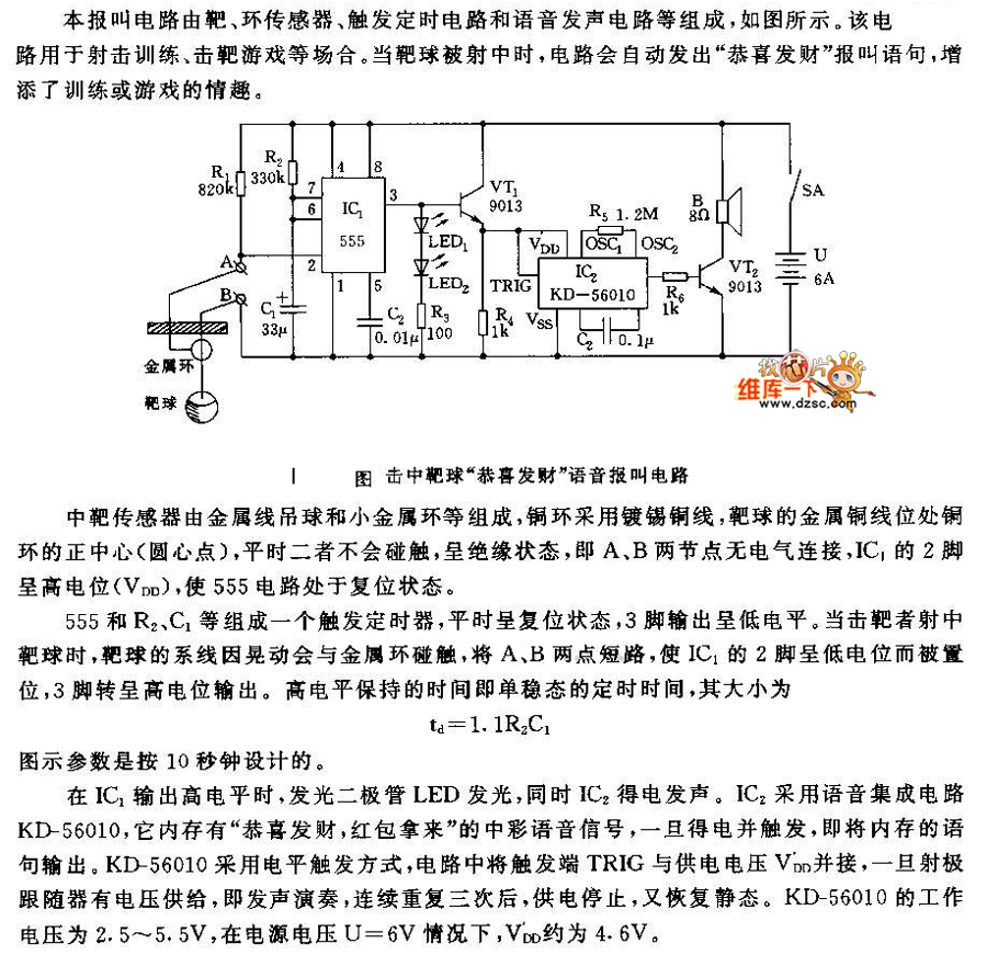 A trigger timer is made of 555 and R2, C1, ordinarily, it is in reset state, 3 foot output is low level. When people hit the target, the tie line of target will touch the gold loop due to shake, then A, B points are short circuit, IC1's 2 foot is low level and it is set, 3 foot turns to high level output. The high level's hold time, namely, the monostable timing time is td=1.1R2C1.