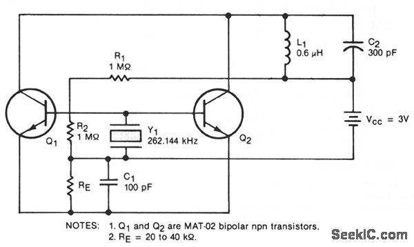 This oscillator circuit includes a quartz crystal that has a nominal resonant frequency of 262,144 Hz and is cut in the orientation that gives a large linear coefficient of frequency variation with the temperature.In this type of circuit, the oscillation frequency is controlled primarily by the crystal-as long as the gain-bandwidth product is at least four times the frequency. In this case, the chosen component values yield a gain-bandwidth product of 1 MHz. Inductor L1 can be made very small: 100 to 200 turns with a diameter of 0.18 in. (4.8 mm) and a length of 0.5 in. (12.7 mm). Although the figure shows two transistors in parallel, one could be used to reduce power consumption or three could be used to boost the output. The general oscillator circuit can be used to measure temperatures from -10 to + 140 °C. A unit made for use in the human body from about 30 to 40 °C operates at 262,144 ± 50 Hz with a frequency stability of 0.1 Hz and a temperature coefficient of 9 Hz/°C.