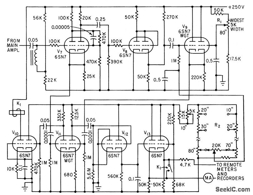 Combined signal output from main amplifier of infrared gage triggers bistable mvbr V7, output of which is rectangular pulse whose width is proportional to steel strip width. Pulse is clamped and amplified by V8 and passed to comparator V9, which provides output proportional in amplitude to width of input pulse.-F. J. Dunks, Infrared Gage Measures Hot Steel Strip Width, Electronics, 33:43, p 65-67.