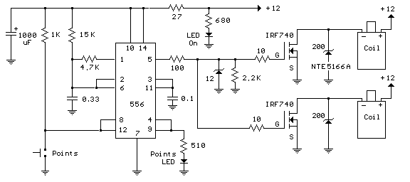 Pin 8 and 12 are the threshold and trigger inputs of one timer which are driven by the breaker points and produce an inverted signal at the timer output (pin 9). When the points are closed to ground, pin 9 will be high and visa versa. The signal at pin 9 controls the reset line (pin 4) of the second timer and holds the output at pin 5 low while pin 4 is low and pins 8 and 12 are high (points open). The 15K and 4.7K resistors and 0.33uF capacitor are the timing components that establish the frequecy and duty cycle of the second timer which is about 4 milliseconds for the positive interval and 2 milliseconds for the negative. During the positive time interval, the MOSFET gates are held high which causes the ignition coil current to rise to about 4 amps. This equates to about 80 millijoules of energy in the coil which is released into the spark plug when the timer output (pin 5) moves to ground, turning off the MOSFET. A 12 volt zener diode is placed at the junction of the 10 and 27 ohm resistors to insure the MOSFET gate input never goes above 12 volts or lower than -0.7 volts. A 200 volt/5 watt zener is used at the MOSFET drain to limit the voltage to +200 and lengthen the spark duration. The circuit should operate reliably with a shorted plug, however operating the circuit with no load connected (plug wires fallen off, etc.) may cause a failure due to most of the power being absorbed by the zener. You can also use a transient voltage suppressor (TVS) such as the 1.5KE200A or 1.5KE300A in place of the zener. It's probably a better part, but hard to obtain.