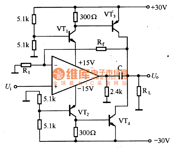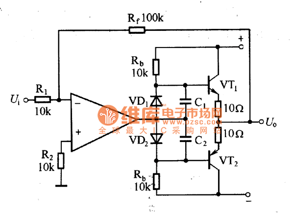 The circuit shown as figure a is a circuit using complementary push-pull output to expand current. When Ui = 0, Uo = 0, the current flows through the base loop of Rb, VD1, VD2 and VT1,VT2 and it provides bias current to VT1 and VT2, which makes it work in A B amplification state and reduce crossover distortion. The weakness of the circuit is that it can't raise voltage range.