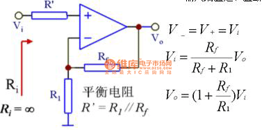 1. The basic circuit: Voltage series negative feedbackThe input end is virtual short, virtual-off The features: input resistance is high, output resistance is small, the load capacity is highV-= V + = Vi, so the common mode input is equal to the input signal, the common mode on the op amp's can suppress the ratio.