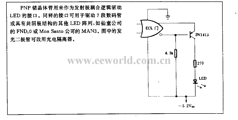 PNP germanium transistors used as a interface of an emitter coupled logic drive LED. The same interface can be used to drive 7-segment Nixie tubeor other LED arrays with common cathode structure, such as Fairchild's FND, 0 or Mon santo company's MAN3. Light-emitting diodes in the figure can switch to optical isolators.
