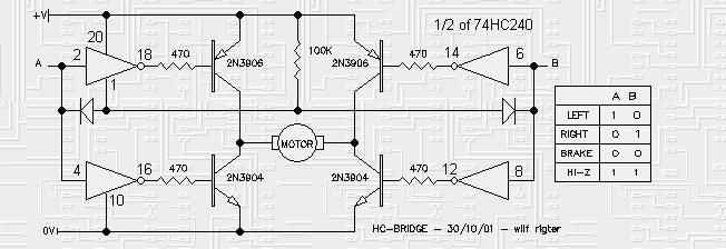Two independently-developed, but very similar designs use a 74HC240's inverters to buffer inputs to a 4-transistor H-bridge.