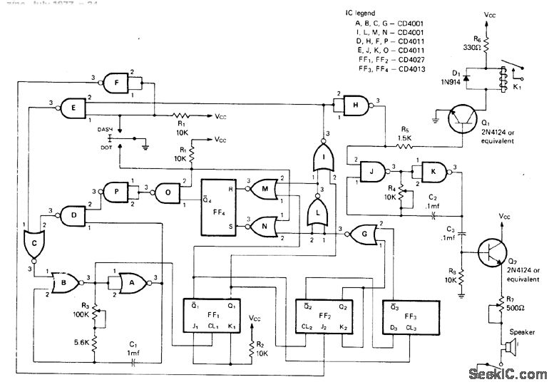 Includes sidetone oscillator and dash-dot memory along with variable speed, automatic spacing, and self-completing dots and dashes. If dot paddleis pressed and released while keyer is generating dash, dot is generated with correct spacing after dash is completed. Gates A, B, and C form gated MVBR.Gates D, E, O, and P serve to complete characters. JK flip-flops FF1 and FF2, D flip-flop FF3, and gates F, G, and L provide character-shaping required for dash-dot memory using gates M, N, and RS flip-flop FF4. Gates J and K generate audio sidetone. K1 is B & F Enterprises ERA21061 SPST reed relay. Supply can be 9-V battery.-T. R. Crawford, A Low-Power Cosmos Electronic Keyer in Two Versions, CQ, Nov.1975, p 17-24.