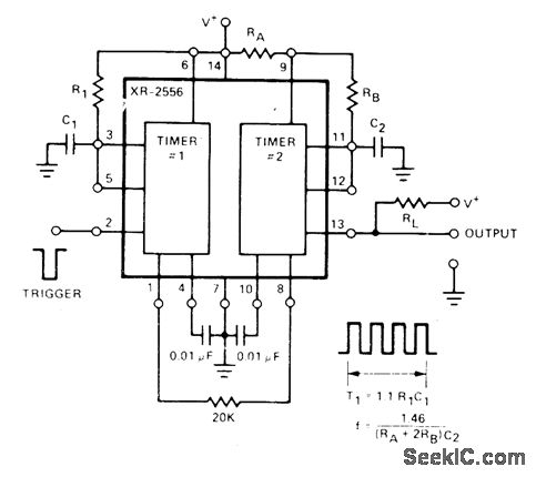 One section of Exar XR-2556 dual timer is operated in free-running mode, with other section used to provide ON/OFF keying. Frequency of oscillator is set by RA, RB, and C2. Timer 1 operates as mono MVBR with output connected to reset pin 8 of timer 2. Trigger drives pin 1 of timer 1 high, keying timer 2 on and producing tone-burst output for duration set by R1 and C1. Supply voltage is 4.5-16 V.- Timer Data Book, Exar Integrated Systems, Sunnyvale, CA, 1978, p 23-30.