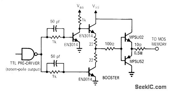 Uses predriverwith three transistors, followed by two-transistor booster, to convert TTL levels to those required by dynamic MOS random-access memory. Booster can be omitted for data input lines be-MEMORY cause they drive such low capacitive loads in typical arrays.-M. E Hoff, Designing an LSI Memory System That Outperforms Cores-Economically,Computer Hardware(section ofEDN Magazine), Jan 15, 1971, p 6-15(p000110-001111)