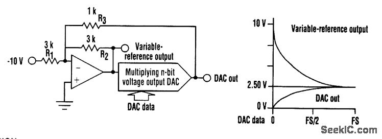 When controlling a nonlinear device, such as an incandescent lamp, it is desirable to have fine resolution at the high end, where a small change in current can cause a large change in brightness.At the low end, coarser resolution is quite adequate. Using the circuit shown, any desired compression can be produced using just about any multiplying DAC. A negative 10-V reference is fed through R1 to inverting amplifier A1, which has an initial gain set to unity by R2. A1's output supplies a positive variable reference to the DAC. The DAC output provides additional feedback through R3, reducing the amplifier's gain as the DAC data increase. The variable reference is gradually reduced so that each step is progressively smaller than the one before. With the values shown, as the DAC data approaches full-scale; the reference approaches 1/4 of its original value. This produces output with four times as much resolution at the high end as at the low end. By decreasing the value of R3, greater compression and higher resolution can be achieved. The variable-reference output also can be useful in some applications.