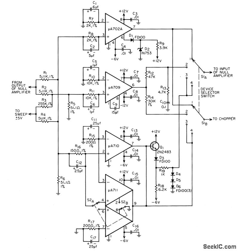 Basic lab tester circuit displays transfer function, offset voltage, gain, linearity, and output voltage swing on single scope trace. High-gain null opera tional amplifier (such as Fairchild 709 IC) is used in feedback loop around linear integrated-circuit amplifier under test, to hold output of amplifier under test at zero by adjusting its d-c input voltage to equal the offset. Chopper on vertical scope inputs allows simultaneous display of offset voltage and transfer function, by switching in synchronism with horizontal sweep. Separate TO-5 socket is provided for each type of integrated circuit to be tested.-J. N. Giles, How to Measure Linear-IC Performance, EEE, 14:8, p 62-68 and 161.