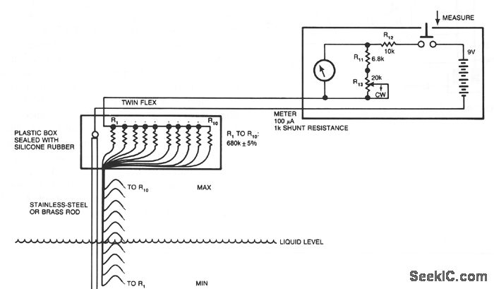 Although many circuits use the varying-capacitance method for checking liquid levels, this simple resistive circuit is much easier to construct. Even a tank of a liquid, such as water, has sufficient conduc-tive salts in solution for this method to work. The probe uses a metal rod that supports 10 insulated wires, which have stripped ends pointing down. As the level of liquid rises, resistors R1 through R10 are succes-sively brought into circuit, each drawing an extra 10 μA through the meter. Shunt resistors R11 and R13 calibrate the meter for a full-scale reading when the tank is full. Resistor R12 limits the current through the meter. If tank isn't rectangular-ie, if the volume of the liquid it contains isn't directly proportional to the liquid's depth-space the resistors accordingly or use a nonlinear progression of resistor values and retain constant resistor spacing.
