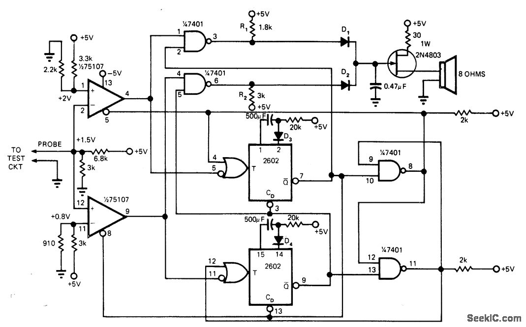 Gives audio indication of TTL states when probe is held on IC pin. Input level above 2 V makes 2N48O3 UJT oscillate at about 400 Hz and give tone from loudspeaker.Logic 0 at probe input gives lower frequency.Logic pulse transitions trigger 2602 dual monos for 1 s, modulating tones at about 1-s rate.Monos also drive two-gate latch that prevents either mono from firing two consecutive times.-I. Simon, Audio Output Eases Logic Level Checking, EDNMagazine, June 20, 1975, p 116and 118.
