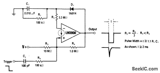 R4 holds output high normally, so C1 is charged almost to V+ level through D1. Negative input trigger forces output of current-differencing amplifier low, and C1 discharges through R1. When decreasing current through R2 approaches current in R3 (when voltage across C1 is about one-third of V+), output switches to high and returns circuit to standby state. Pulse width, equal to 1.1R1C1, can be programmed easily by using pot or some form of manual or electronic switching for R1 .-W. G. Jung, IC Op-Amp Cookbook, Howard W. Sams, Indianapolis, IN, 1974, p 510-512.