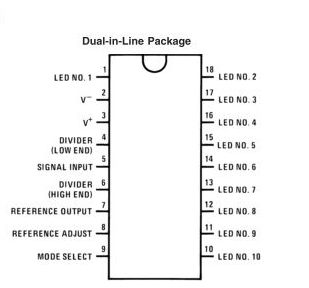 The LM3915 datasheet specifies that the IC is a monolithic integrated circuit that senses analog voltage levels and drives ten LEDs, LCDs or vacuum fluorescent displays, providing a logarithmic 3 dB/step analog display. One pin changes the display from a bar graph to a moving dot display. LED current drive is regulated and programmable, eliminating the need for current limiting resistors. The whole display system can operate from a single supply as low as 3V or as high as 25V.