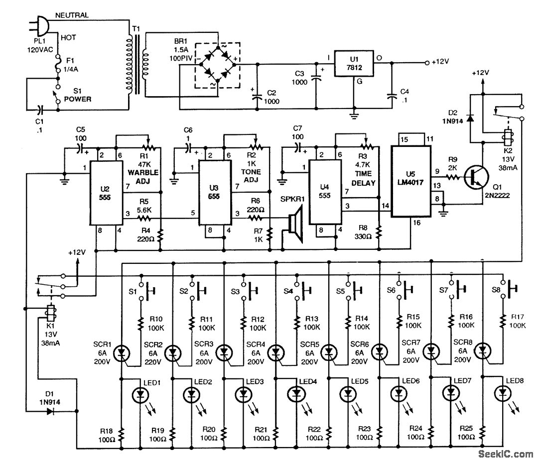 This circuit is used in contests,games,etc When a contestant presses one of the buttons,an SCR triggers,lighting the associated LED and preventing anyone else from actuating the system .U2 and U3 form a warble tone generator, while U4 and U5 provide time delay.