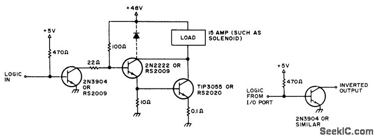 Load is energized when logic input drops to 0. Can be used to drive solenoid or electromagnet from 48-VDC supply, for stopping paper tape in high-speed tape reader. If relay is to be activated by high or 1 level, add inverter at input as shown.-D. D. Mickle, Practical Computer Projects, 73 Magazine, Jan. 1978, p 92-93.