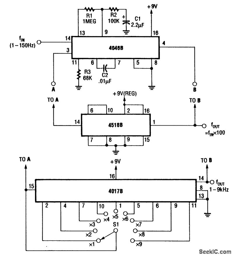 By using a 4017B and a 1-kHz fIN, the circuit can be used as a 1-to 9-kHz frequency synthesizer or as a x 10 frequency multiplier.