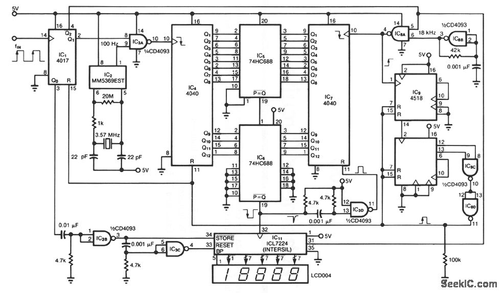 This tachometer lets you measure heartbeats, respiratory rates, and other low-frequency events that recur at intervals of 0.33 to 40.96 seconds. The circuit senses the period of fIN, computes the equivalent pulses per minute, and updates the LCD accordingly. Although the decimal readout equals 60 fIN, the circuit doesn't actually produce a frequency of 60 fIN. The computation involves counting and comparison techniques and takes 0.33 seconds.